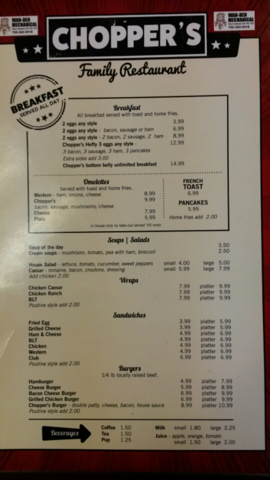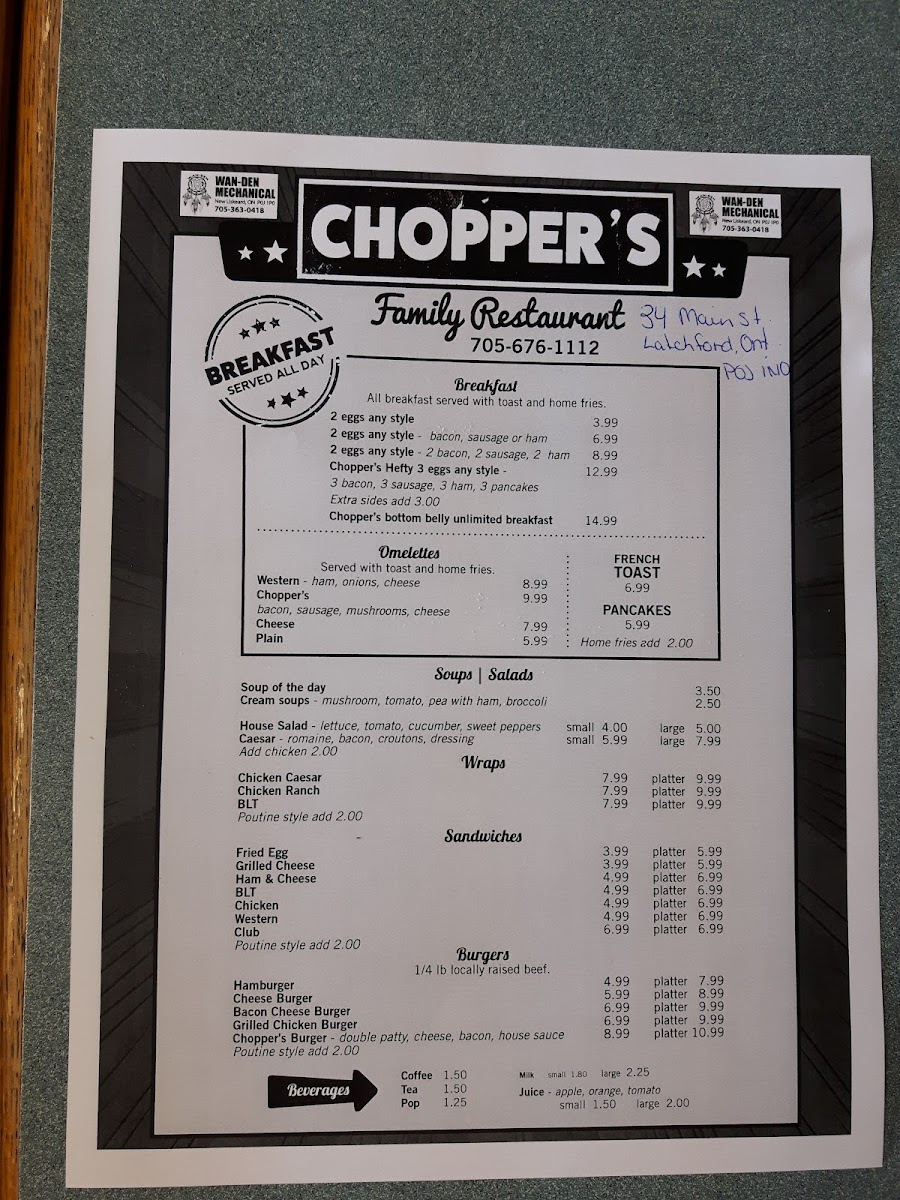 Welcome to Choppers Family Restaurant, a gem nestled at 34 Main St, Latchford, ON. This cozy eatery is renowned for its hearty, farm-fresh meals and generous portions that won't break the bank. Patrons rave about the all-day breakfast, a delightful feast that serves as a perfect start to any day. An eager crowd ensures a bustling vibe, making it the ideal pit stop for travelers seeking comfort food with a rustic touch.
